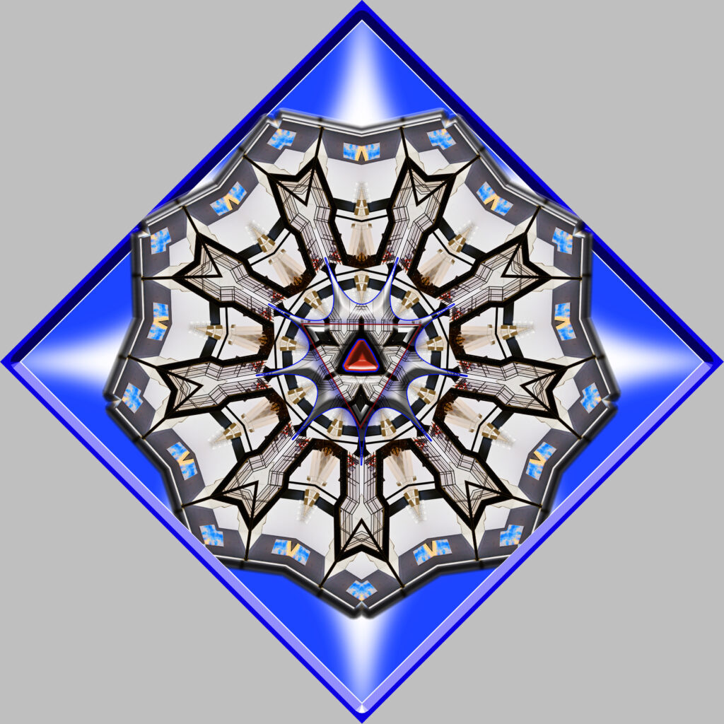 Als physisches Bild ist dieses Darpanagram auf weiße Satinleinwand gedruckt und auf einen Keilrahmen 60 x 60 cm aufgespannt, mit einer Aufhängevorrichtung versehen, nummeriert und vom Künstler handsigniert. Als Raute gehängt misst das Bild über die Diagonalen ca. 85 x 85 cm.