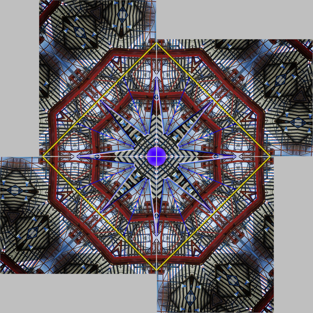 Als physisches Bild ist dieses Darpanagram auf weiße Satinleinwand gedruckt und auf vier Keilrahmen 60 x 80 cm aufgespannt, jedes mit einer Aufhängevorrichtung versehen, nummeriert und auf einem Bild aus dem Tableau vom Künstler handsigniert. Die Gesamtgröße des Tableaus beträgt 160 x 160 cm.